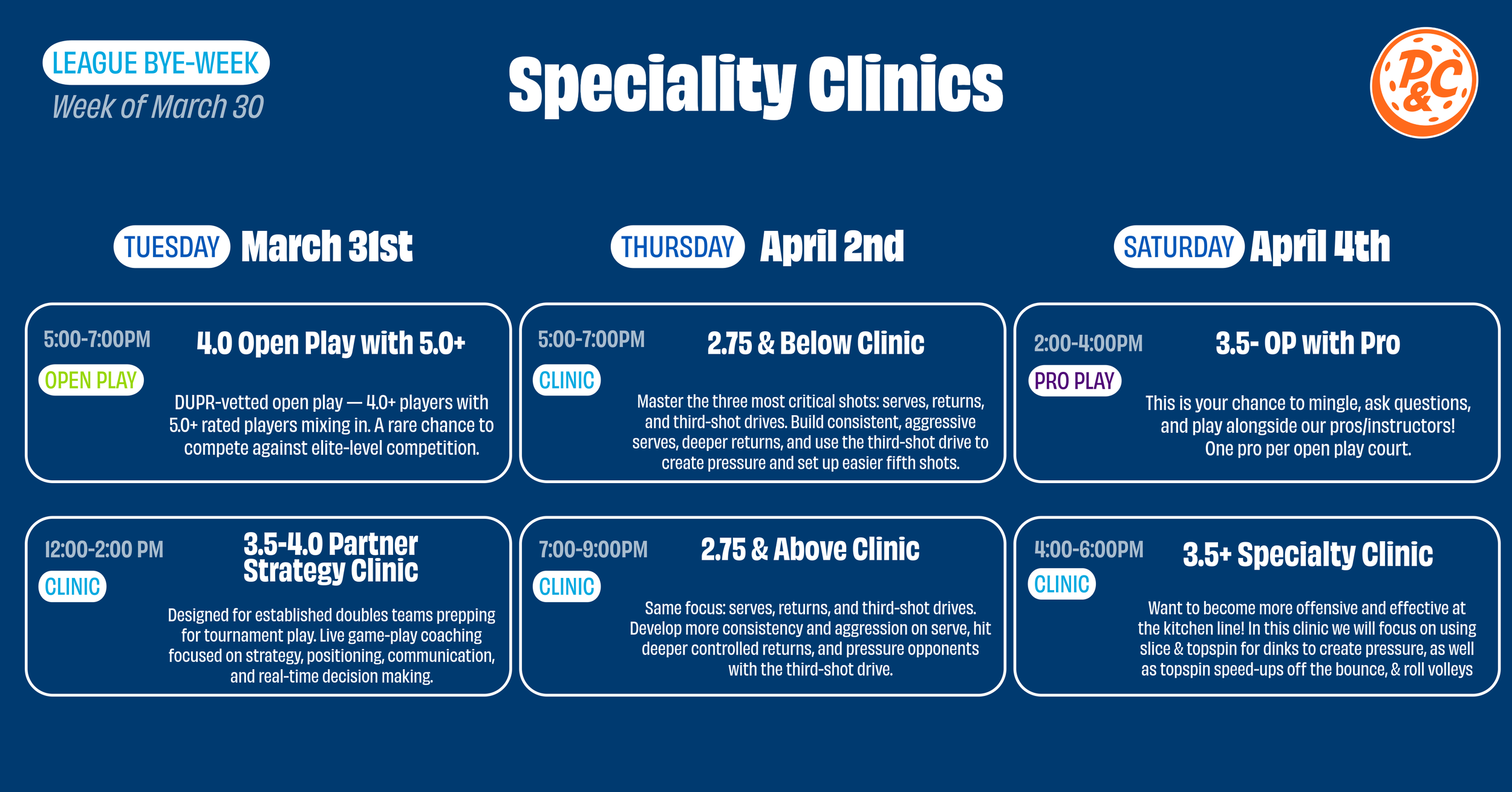 [Same description for both] This specialty clinic will focus on three of the most important shots in pickleball: serves, returns, and third-shot drives. Players will work on developing more consistent and aggressive serves, hitting deeper and more controlled returns, and using the third-shot drive to create pressure and set up easier fifth shots.